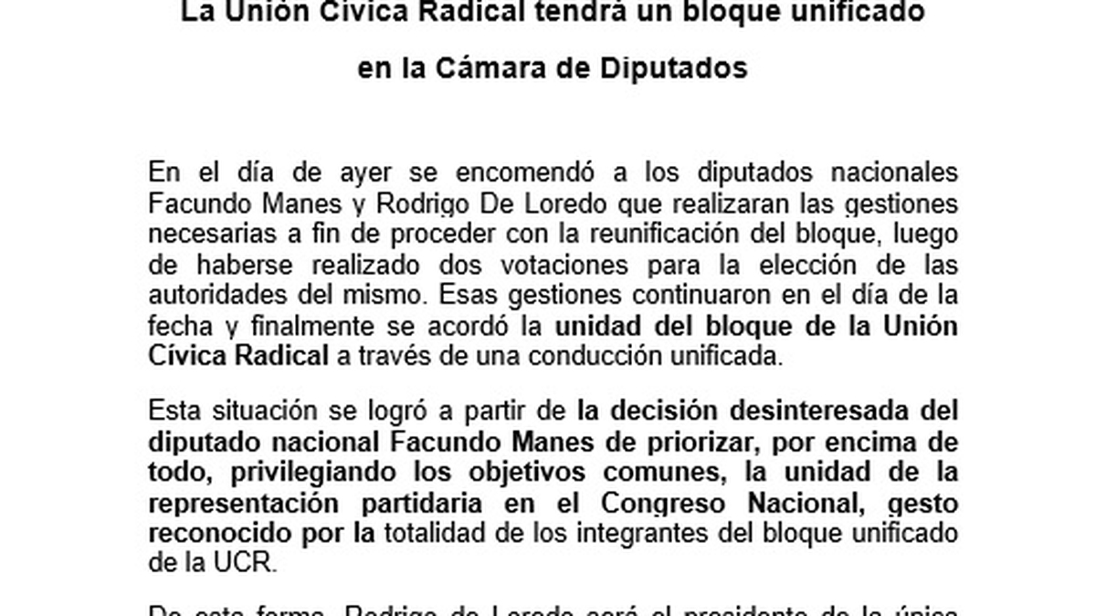 Después de varias negociaciones, la UCR logró unificar el bloque en la Cámara de Diputados y Rodrigo de Loredo será el presidente, según confirmó en un comunicado. Los correligionarios llegaron a un acuerdo entre los que impulsan al referente de Evolución y a Facundo Manes, quien era apoyado por Gerardo Morales, actual presidente del Comité Nacional. De este modo, el partido centenario contará con 35 legisladores desde el 10 de diciembre.