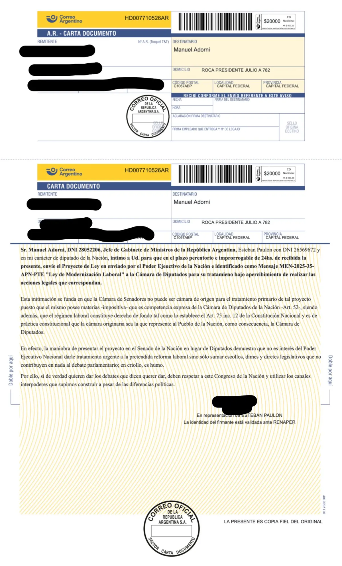 Por eso, reclamo que "el proyecto de Reforma Laboral no puede entrar por el Senado" y fundamentó con el el artículo 52 de la Carta Magna: "Las leyes impositivas deben iniciar en la Cámara de Diputados".