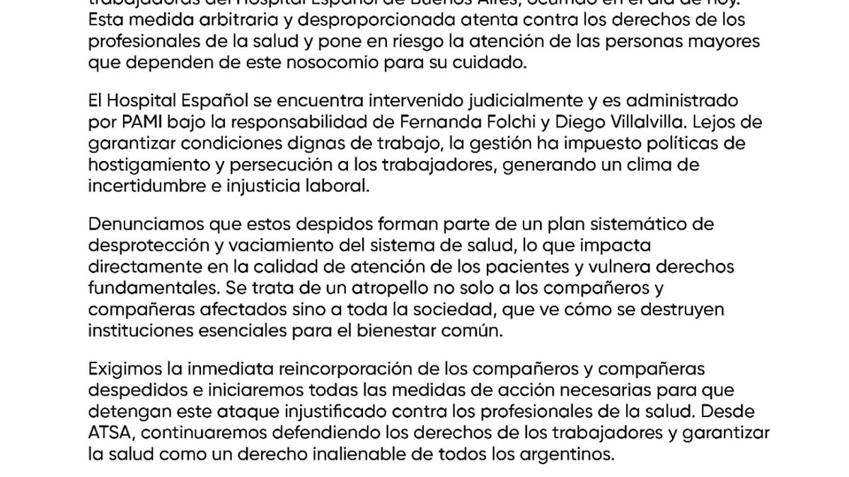 Por su parte, Héctor Daer, titular de la CGT y del gremio de Sanidad, hasta ahora dialoguista con el Gobierno, denunció este martes el despido de 250 trabajadores de Sanidad en el Hospital Español, que es administrado por la intervención del PAMI, según señaló en un comunicado en el que además, denuncia el vaciamiento de hospitales públicos y del sistema de salud nacional.