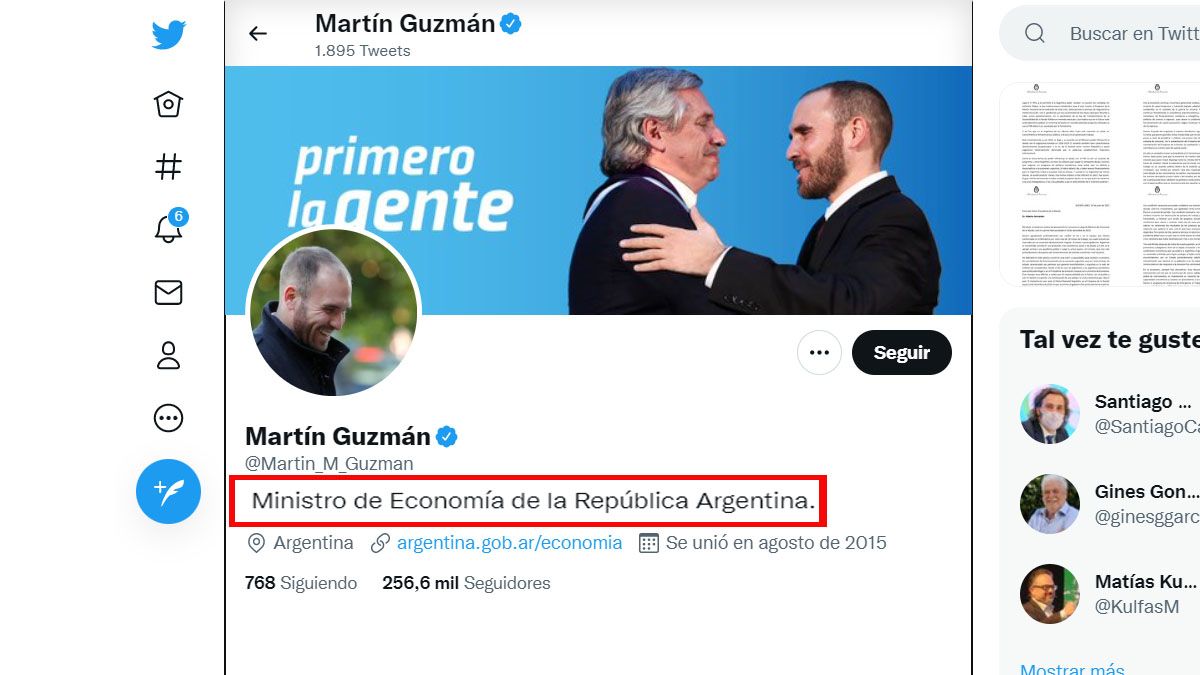 Martín Guzmán, ministro de Economía de la República Argentina. No se trata de un error de esta página, producto de sus 935 días en ese cargo, sostenido por el presidente Alberto Fernández. Así sigue figurando, este lunes, en su portal de su cuenta oficial de Twitter y cerca de las 15 horas. Una situación un tanto curiosa ya que este día debe iniciar sus funciones, Silvina Batakis, nombrada en el final de un frenético fin de semana para el país.