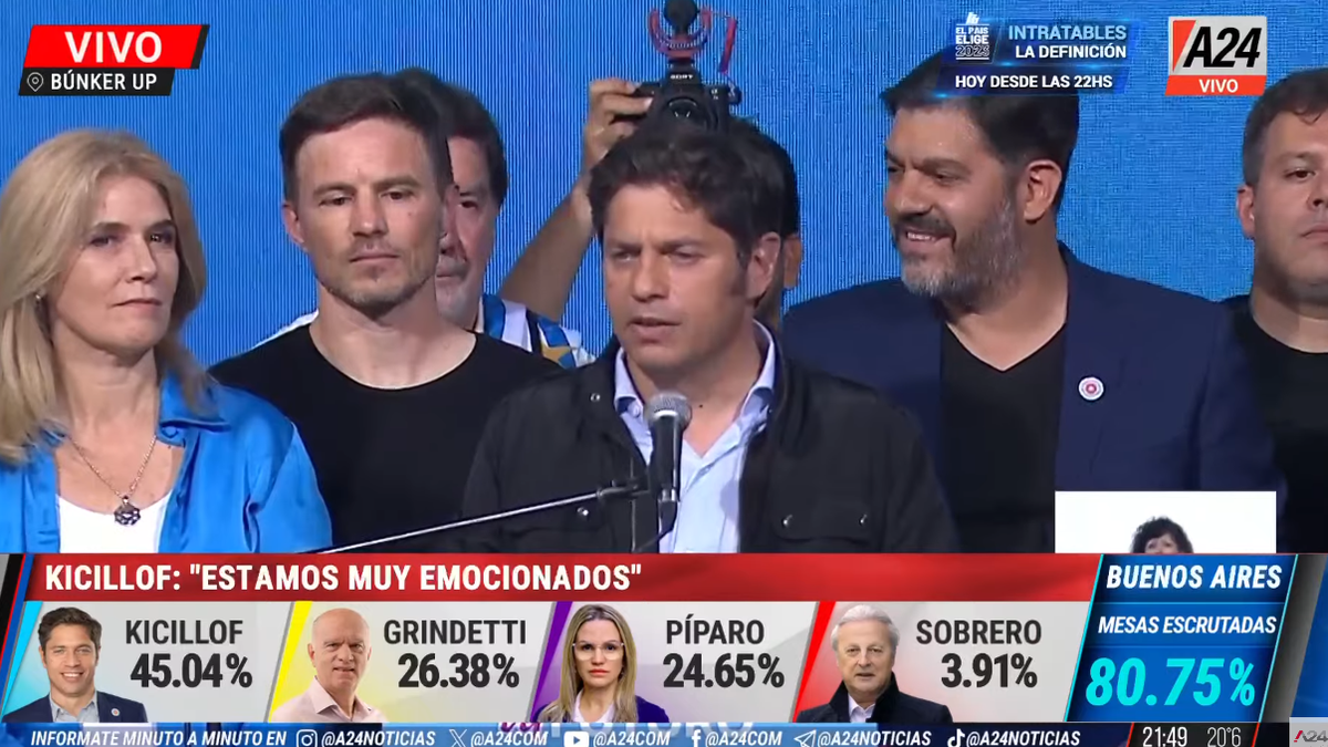Tal como había anticipado A24.com, Kicillof fue el primero en salir a confirmar el triunfo, luego de que la Dirección Nacional Electoral y la Justicia anunciara la tendencia firme de los resultados con el 78% de las mesas escrutadas en la provincia de Buenos Aires.
