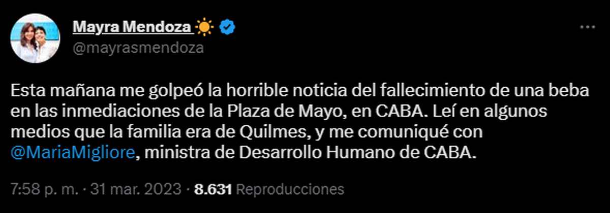 La intendenta de Quilmes, Mayra Mendoza, salió a aclarar que el padre y la madre de la beba que murió este viernes en inmediaciones de la Casa Rosada "no residen" en dicho municipio, y así cuestionó "la intencionalidad de ciertos medios de endilgarle la responsabilidad a esta gestión, con el objetivo de proteger otras".