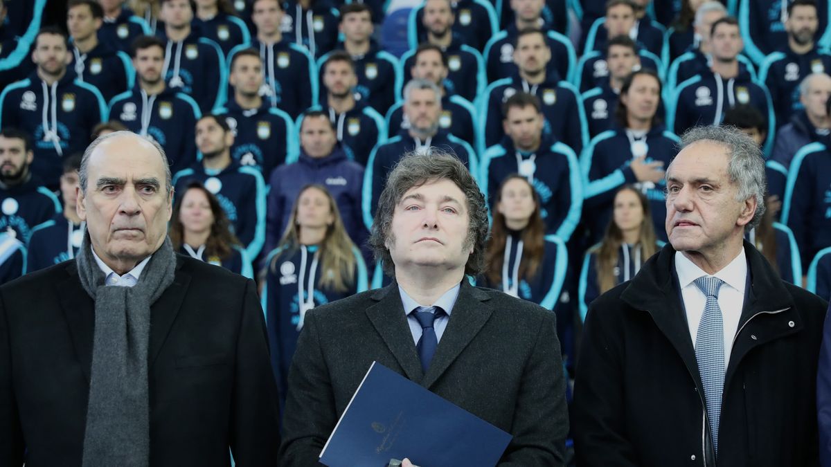 Javier Milei junto al jefe de Gabinete, Guillermo Francos y el secretario de Turismo y Deportes, Daniel Scioli durante el acto de despedida de la delegación de deportistas argentinos rumbo a las Olpimiadas de París. .jpeg