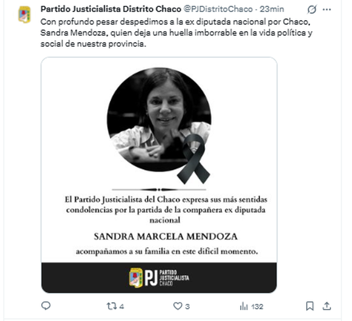 Asimismo, la conducción partidaria expresó su acompañamiento a las hijas de Mendoza, Guillermina y Jorgelina; a su hermana Lichi; y a demás familiares, amigos y seres queridos. "Compartimos la tristeza por su partida", señalaron en el texto, en el que también elevaron oraciones por el "eterno descanso de su alma".