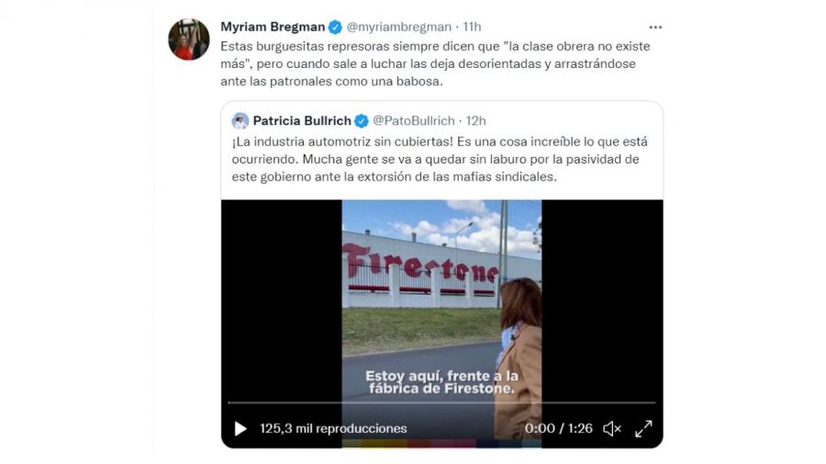 El conflicto gremial que atraviesan las fábricas de neumáticos de la Argentina sigue generando cruces en la política. En esta oportunidad, Patricia Bullrich visitó la planta de Firestone y cuestionó a los sindicalistas por llevar al eventual cierre definitivo de las empresas. Tras sus dichos, la diputada izquierdista Myriam Bregman salió al cruce y la calificó de "burguesita represora".