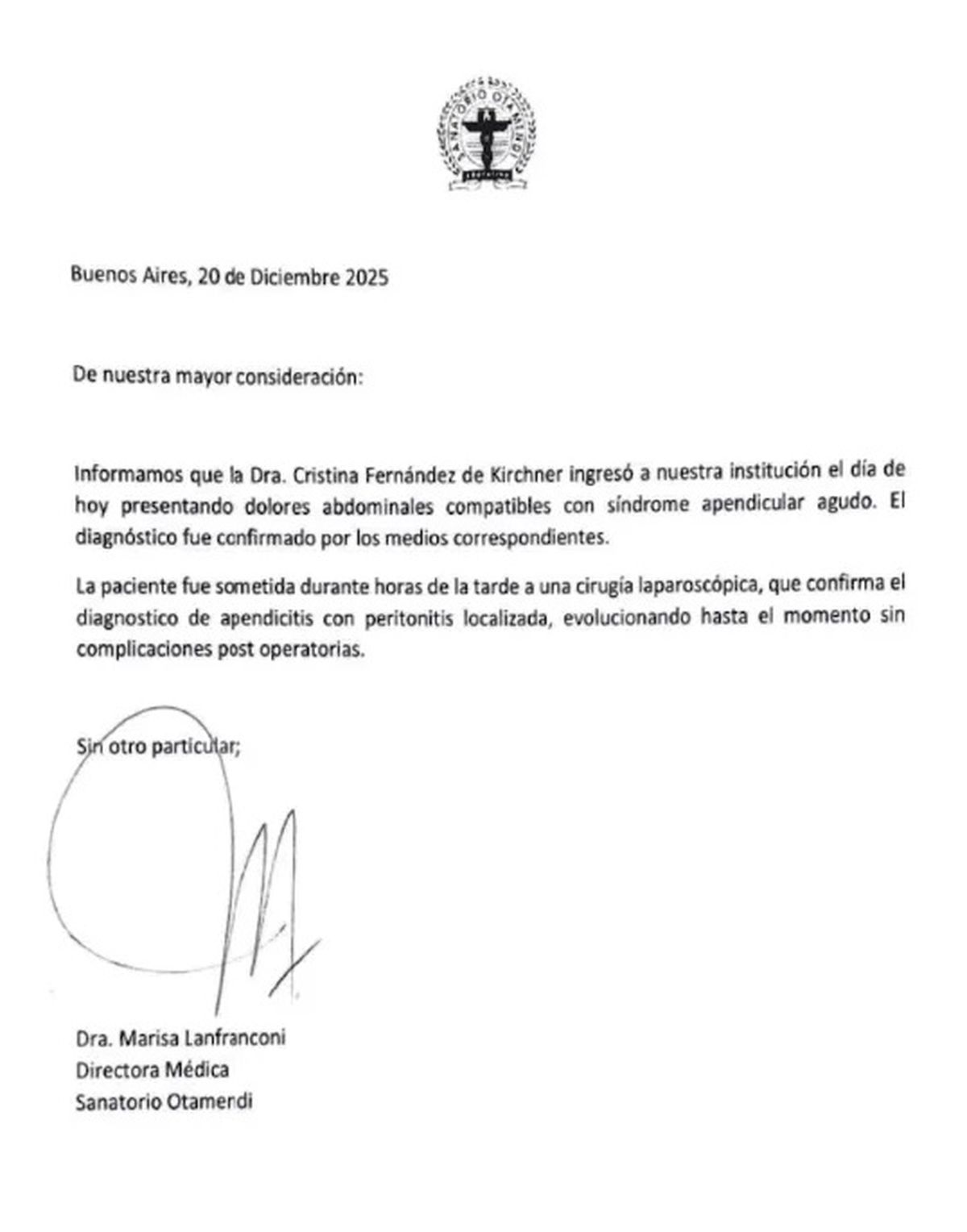 La expresidenta Cristina Fernández de Kirchner fue sometida este sábado a una cirugía de urgencia por un cuadro de apendicitis en el Sanatorio Otamendi, donde permanece internada y bajo observación. Según el primer parte médico oficial, la intervención se realizó durante la tarde y la evolución es favorable, sin complicaciones postoperatorias.