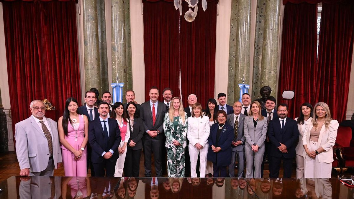 Karina Milei, Manuel Adorni y Diego Santilli encabezaron la foto con el bloque de senadores de LLA, luego de la jura y en medio de un primer cruce entre Bullrich y Villarruel. Foto LLA.