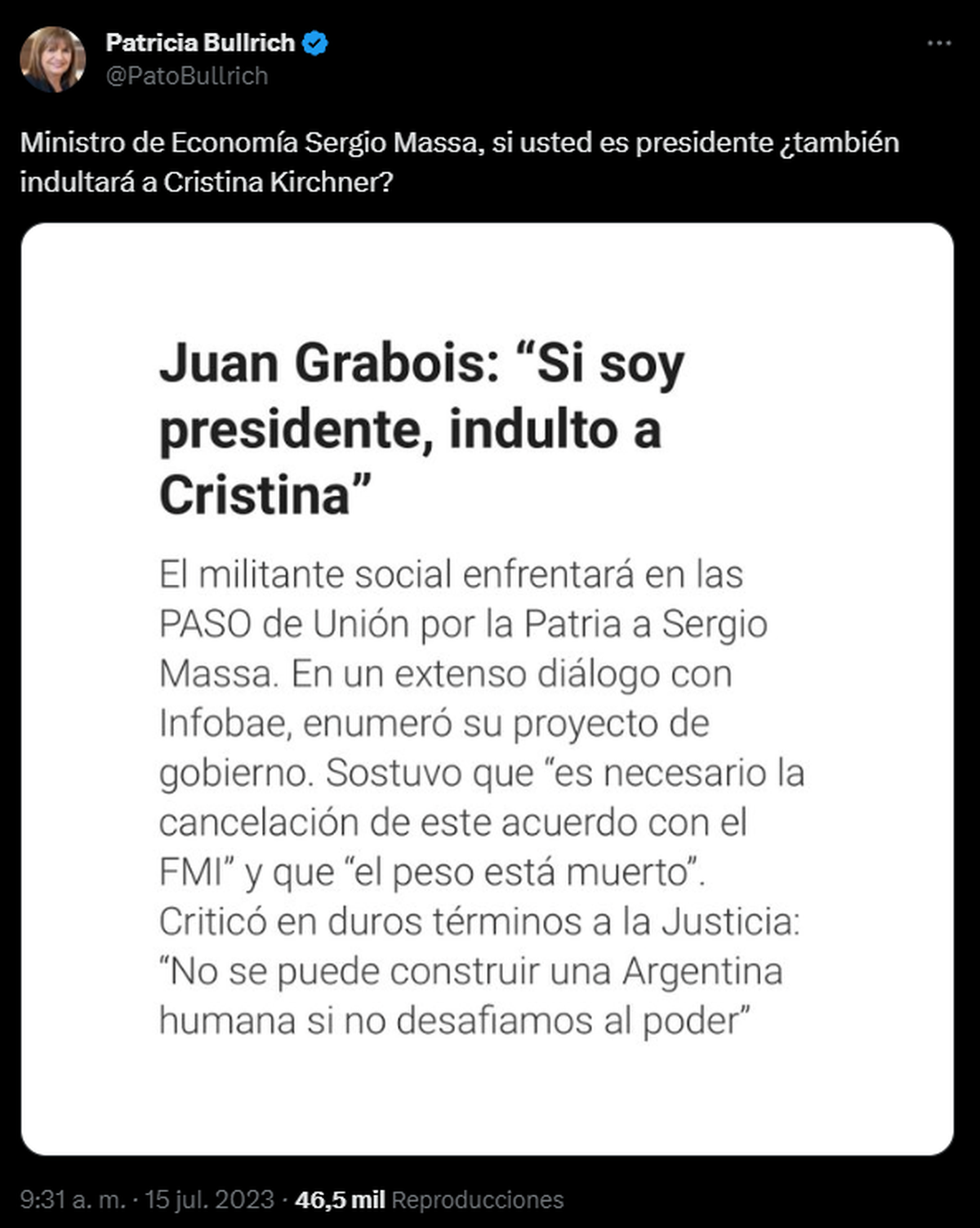 La precandidata a presidenta de Juntos por el Cambio, Patricia Bullrich, confrontó al precandidato de Unión por la Patria, Sergio Massa, y le preguntó si, en el caso de ser electo presidente, indultaría a la vicepresidenta Cristina Fernández de Kirchner.