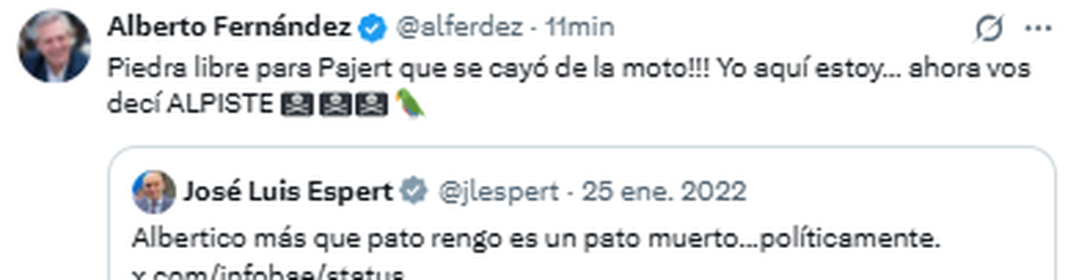Luego de que José Luis Espert confirmara oficialmente su renuncia a la postulación como diputado nacional por la provincia de Buenos Aires, en medio de fuertes tensiones internas dentro de La Libertad Avanza y versiones cruzadas sobre presuntas operaciones en su contra, la noticia tuvo un inesperado capítulo paralelo en las redes sociales: el expresidente Alberto Fernández reapareció para burlarse del economista, retomando su clásico estilo irónico en X (ex Twitter).