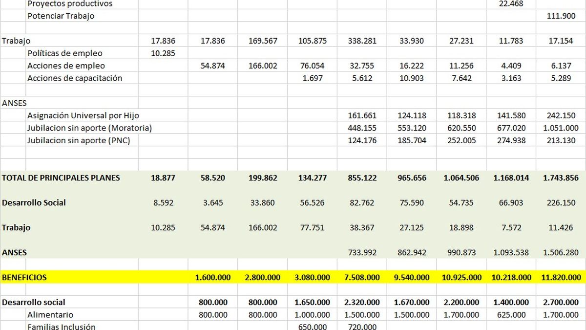 El total de beneficios es de 11,8 millones, cifra que no incluye las jubilaciones, de los cuales 1 millón son planes Potenciar Trabajo, que en teoría el Ministerio de Desarrollo Social asigna para cumplir tareas laborales, lo que no siempre ocurre. La partida para 2021 de ese programa es de 111,9 mil millones de pesos.
