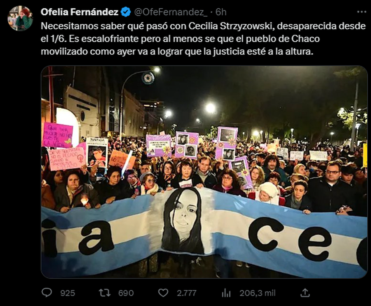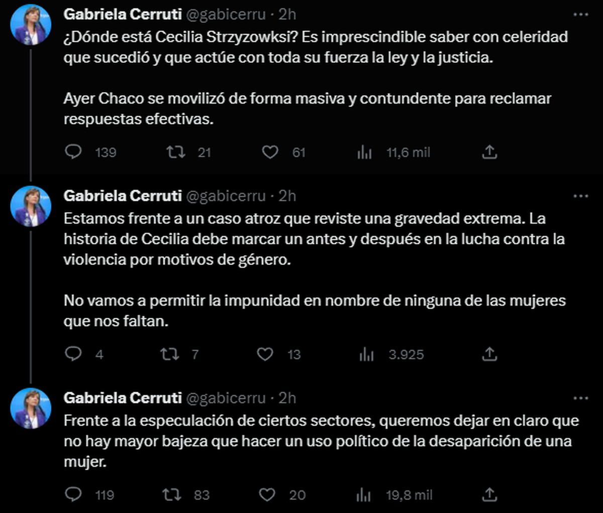 La portavoz de la Presidencia, Gabriela Cerruti; la legisladora porteña Ofelia Fernández y la funcionaria bonaerense Victoria Donda se manifestaron este jueves en las redes sociales respecto de la desaparición de Cecilia Strzyzowski en Chaco, una mujer de 28 años que fue vista por última vez el 1 de junio y se sospecha ahora que podría haber sido víctima de un femicidio.