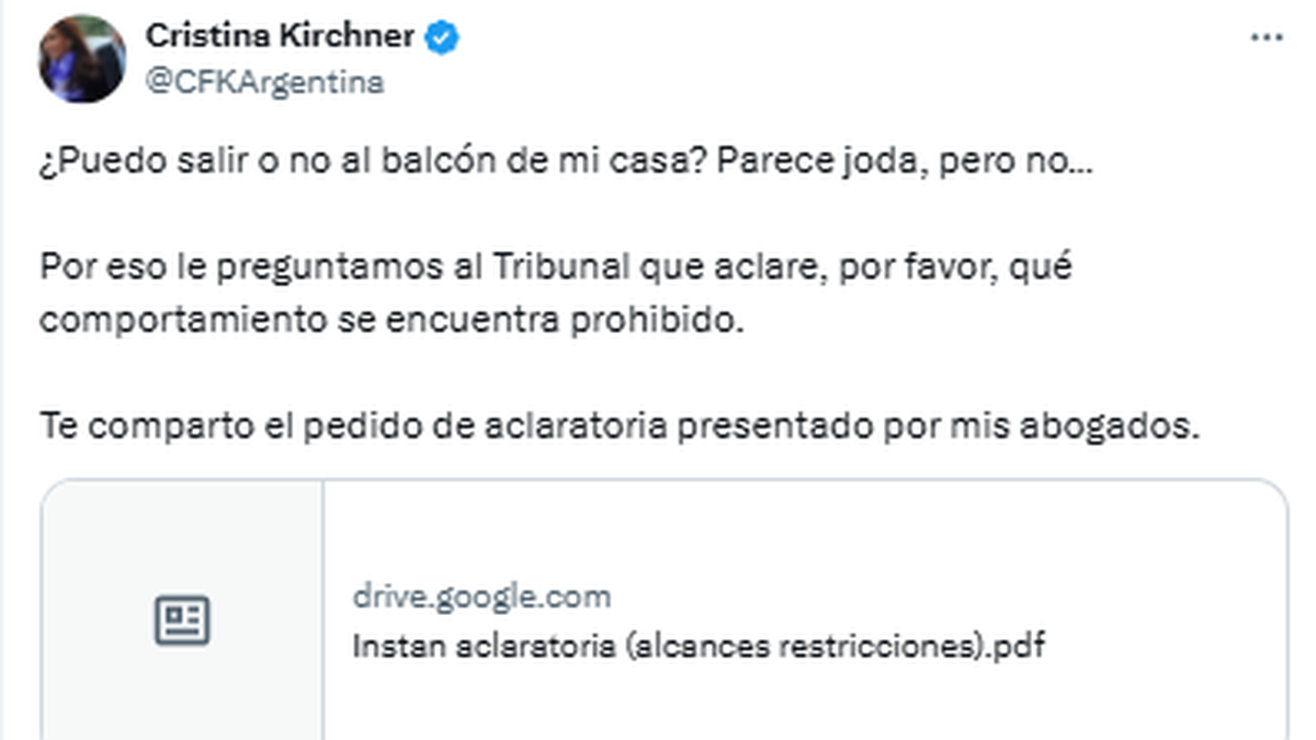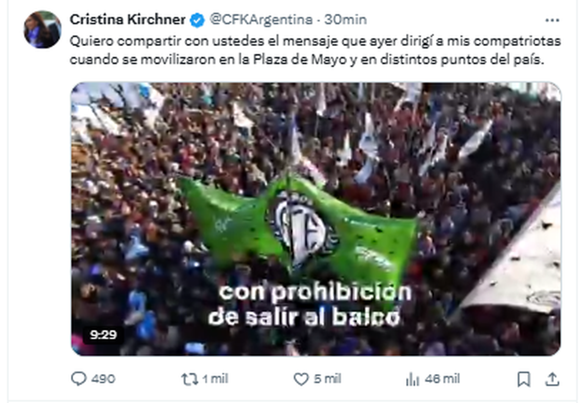 La expresidenta Cristina Fernández de Kirchner volvió a publicar un posteo en su cuenta de la red social X, tras el acto en su apoyo en la Plaza de Mayo en el que, pese a haber iniciado ya su detención domiciliaria, participó como única oradora a través de un mensaje grabado y un corto saludo en vivo.