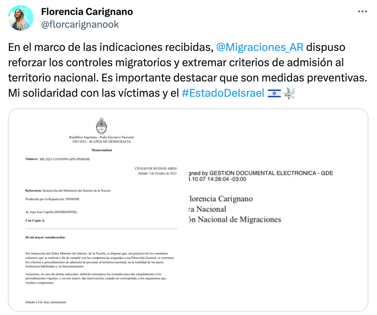 La directora nacional de Migraciones, Florencia Carignano, informó que se dispuso "reforzar los controles migratorios" y "extremar criterios de admisión al territorio nacional" como parte de las medidas dispuestas por el Gobierno ante el sorpresivo ataque de la organización Hámas en territorio israelí que dejó hasta el momento cientos de muertos y heridos.