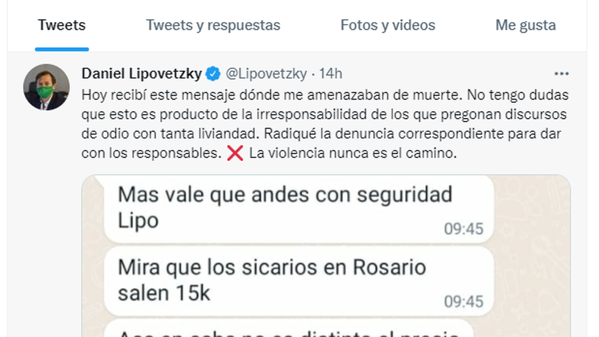 El diputado provincial de Juntos por el Cambio Daniel Lipovetzky se expresó este martes sobre las amenazas de muerte que recibió ayer a través del WhatsaApp. "Es muy preocupante", indicó. Al respecto, la portavoz de Presidencia, Gabriela Cerruti, se solidarizó con el funcionario.