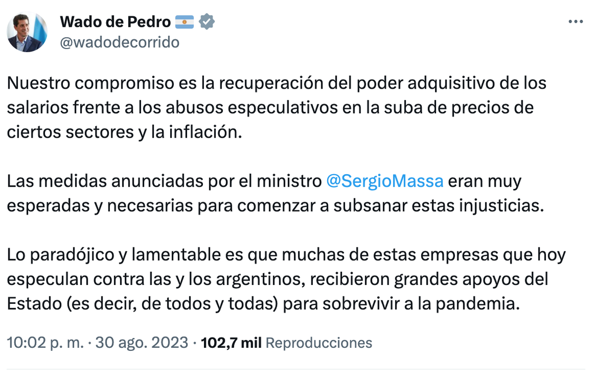 El ministro de Interior, Eduardo "Wado" de Pedro, indicó este miércoles que el compromiso del gobierno nacional es "la recuperación del poder adquisitivo de los salarios" y criticó los "abusos especulativos" de quienes recibieron apoyos del Estado y ahora suben los precios.