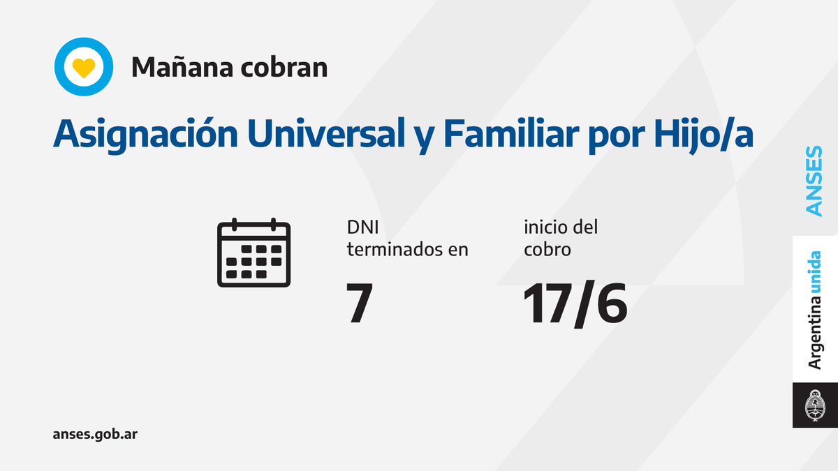 Con la utilización de la tarjeta de débito, los titulares con documentación terminados en 7, reciben este 17 de junio la Asignación Universal por Hijo (AUH) y la Asignación Familiar por Hijo.