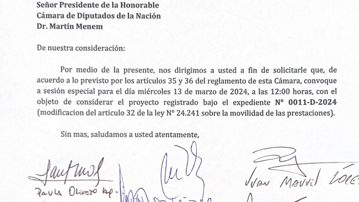 En una carta presentada al presidente de la Cámara de Diputados, Martín Menem, legisladores de la oposición le pidieron el tratamiento urgente de la reforma jubilatoria en el recinto para que sea orden del día el próximo miércoles 13 a partir de las 12 horas.