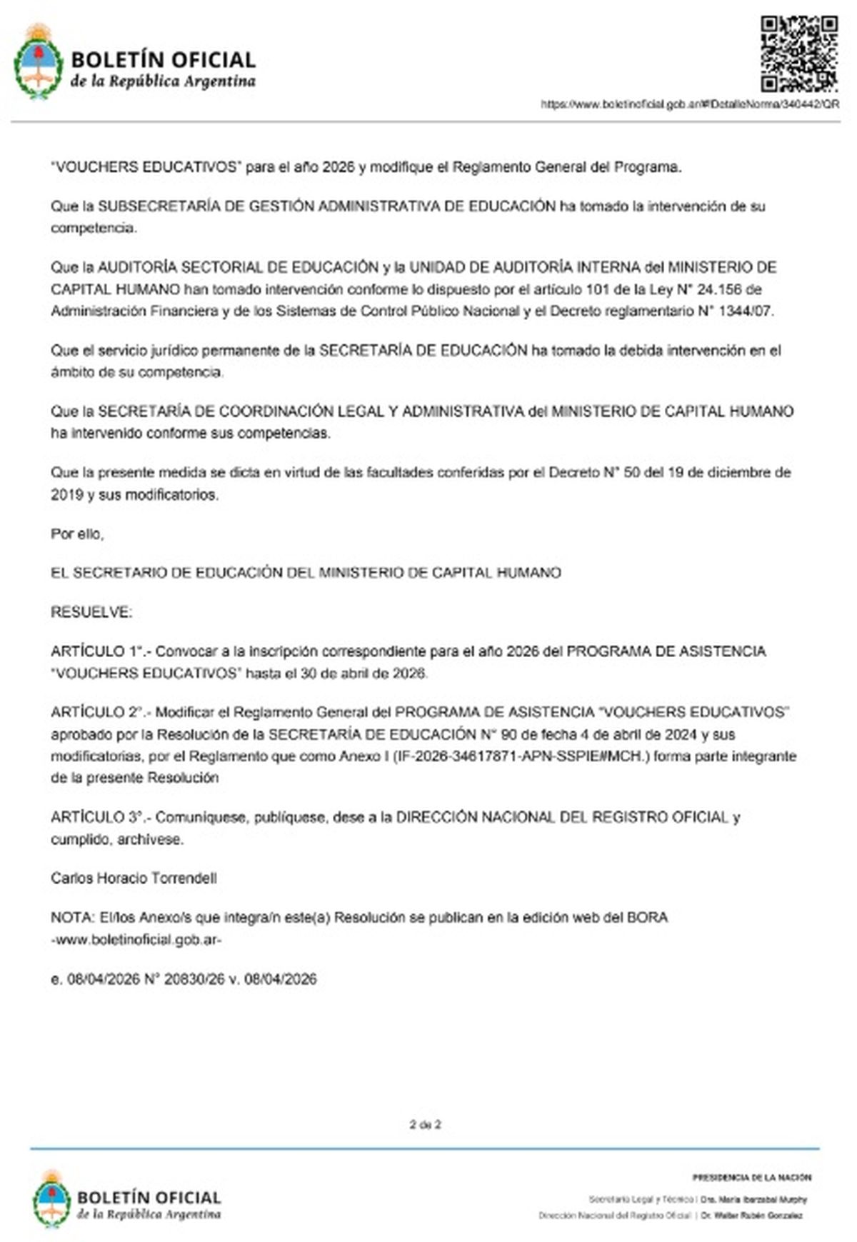 La medida fue publicada este 8 de abril en el Boletín Oficial de la República Argentina y lleva la firma del secretario de Educación, Carlos Horacio Torrendell, bajo la órbita del Ministerio de Capital Humano. Allí se detallan los procedimientos administrativos, los requisitos y el marco normativo actualizado que regirá el programa durante este año.