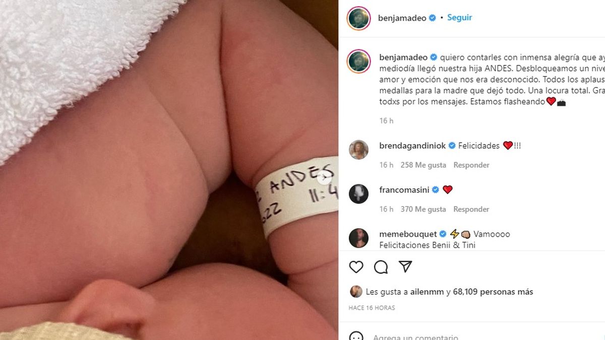 El actor y cantante Benjamín Amadeo fue padre de Andes y mostró la primera imagen de la beba en Instagram. La reacción de su ex, Lali Espósito.