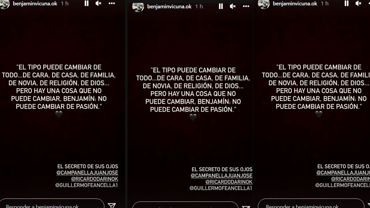 “El tipo puede cambiar de todo… de cara, de casa, de familia, de novia de religión, de dios… Pero hay una cosa que no puede cambiar, Benjamín: no puede cambiar de pasión”, escribió el actor al que sumó un corazón negro.