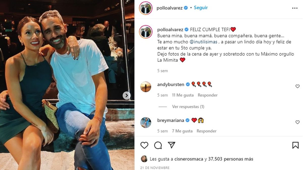Hace unas semanas, El Pollo Álvarez le dedicó un sentido mensaje en Instagram a su esposa Tefi Russo en el día de su cumpleaños. "FELIZ CUMPLE TEFI. Buena mina, buena mamá, buena compañera, buena gente… Te amo mucho @inutilisimas , a pasar un lindo día hoy y feliz de estar en tu 5to cumple ya. Dejo fotos de la cena de ayer y sobretodo con tu Máximo orgullo La Mimita", expresó emocionado.