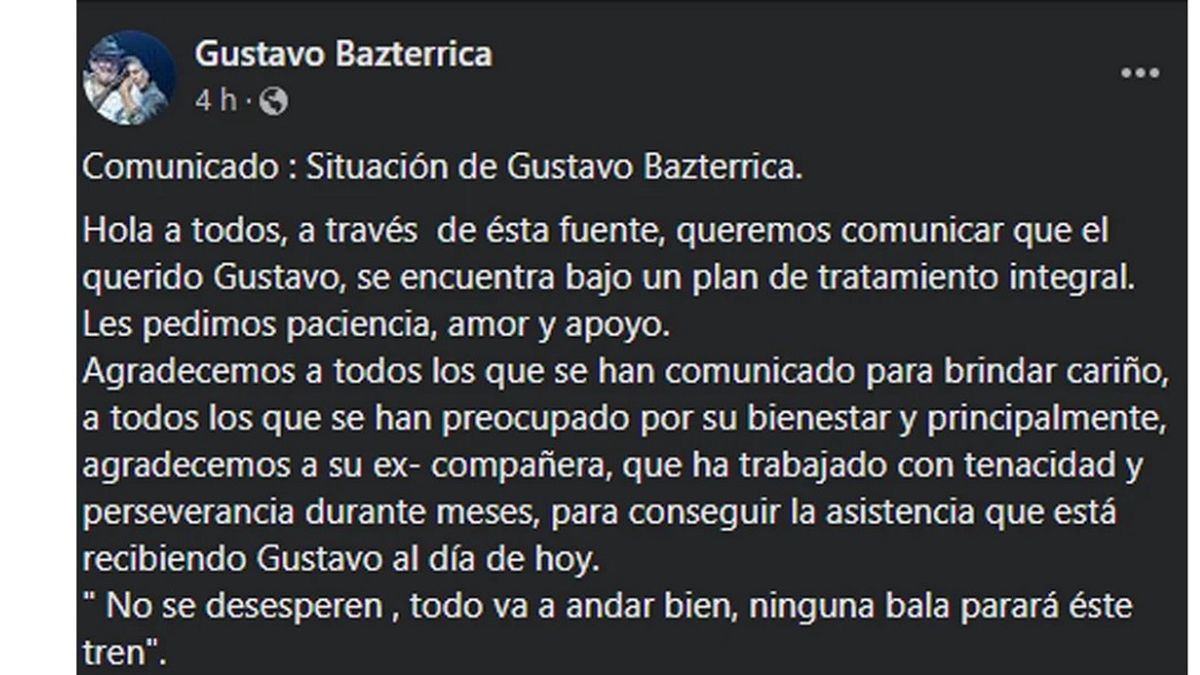 “Hola a todos, a través de ésta fuente, queremos comunicar que el querido Gustavo se encuentra bajo un plan de tratamiento integral. Les pedimos paciencia, amor y apoyo”, comienza el posteo.
