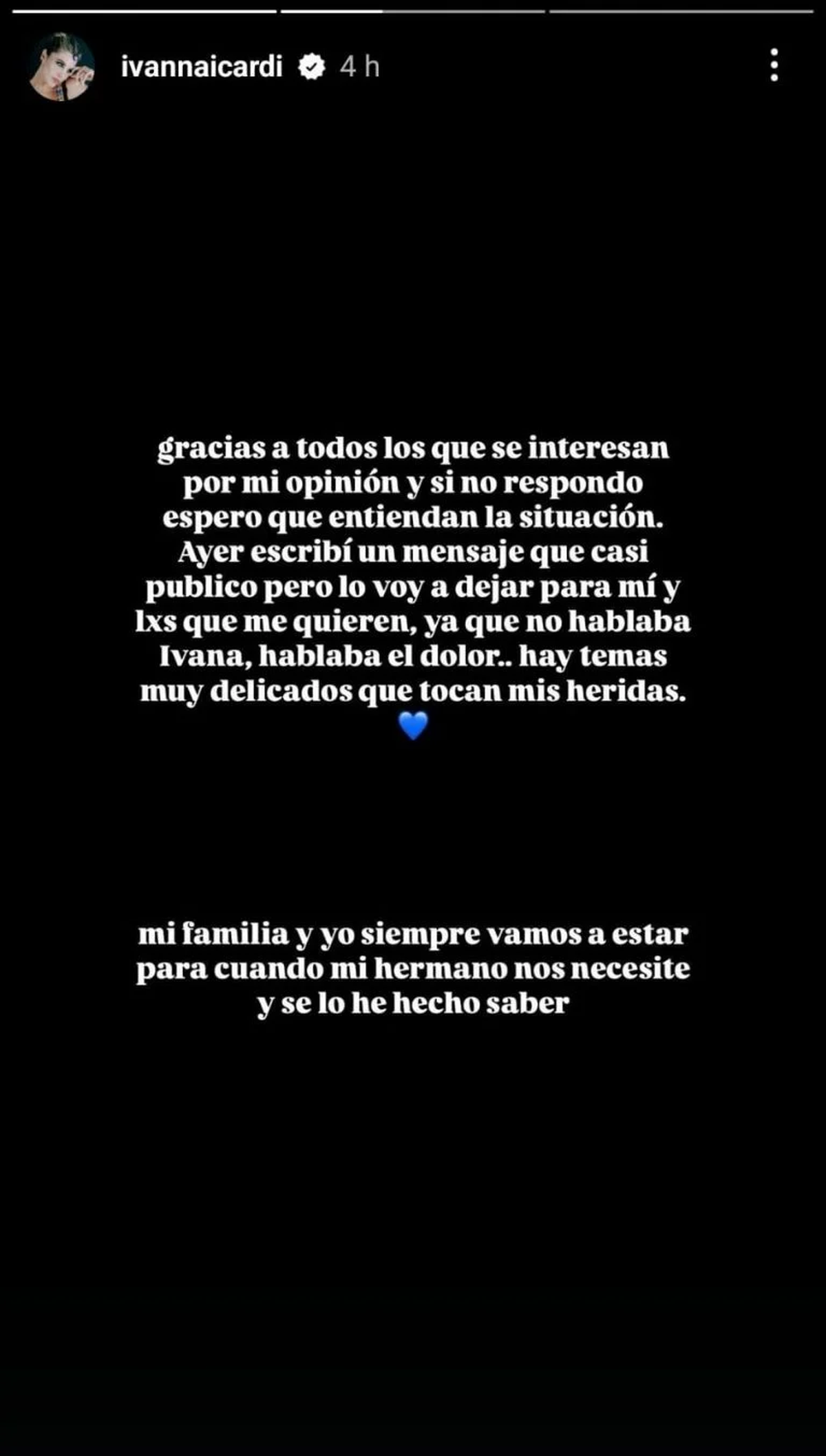 La hermana de conductor expresó que intentará mantenerse al margen de cualquier polémica. "Gracias a todos los que se interesan por mi opinión y si no respondo espero que entiendan la situación. Ayer escribí un mensaje que casi público pero lo voy a dejar para mí y lxs que me quieren ya que no hablaba de Ivana, hablaba del dolor. Hay temas muy delicados que tocan mis heridas”, expresó.