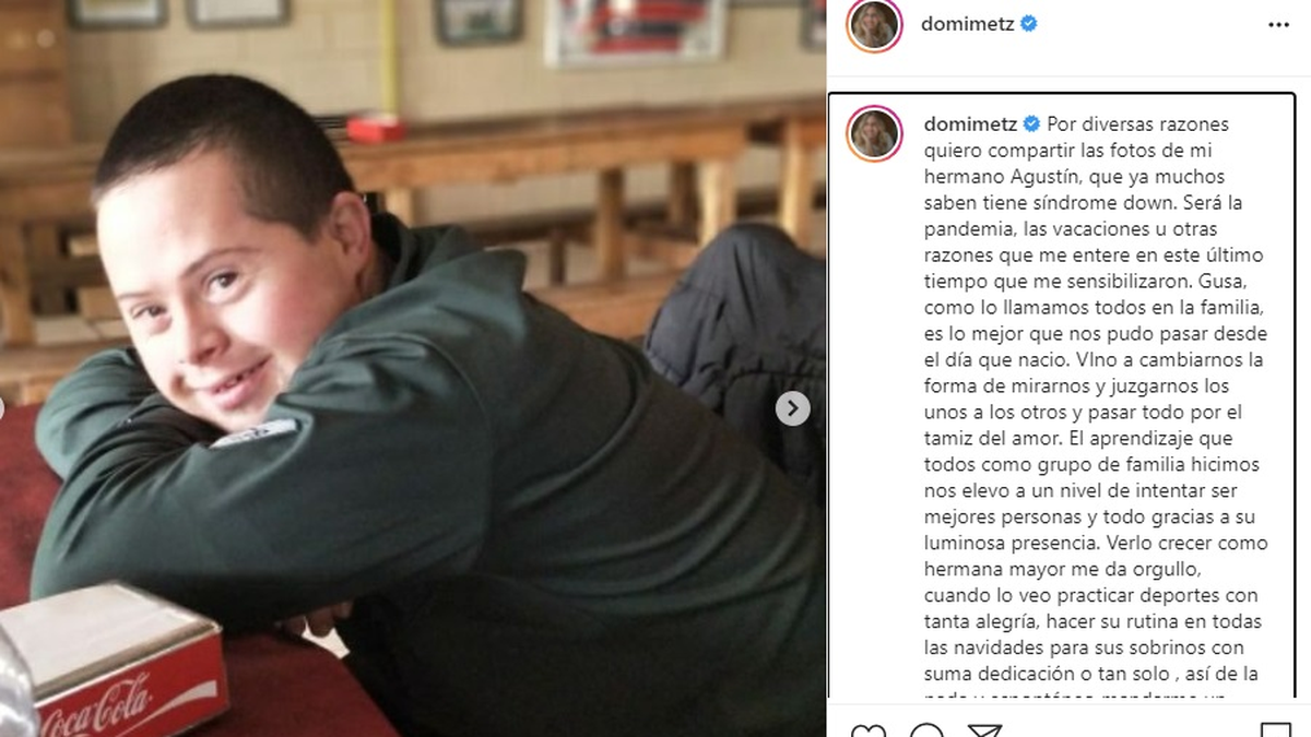 Dominique Metzger compartió una emotiva historia familiar este martes desde su cuenta de Instagram al mostrar imágenes de su hermano Agustín, "Gusa" como lo llaman cariñosamente, quien tiene síndrome de down.