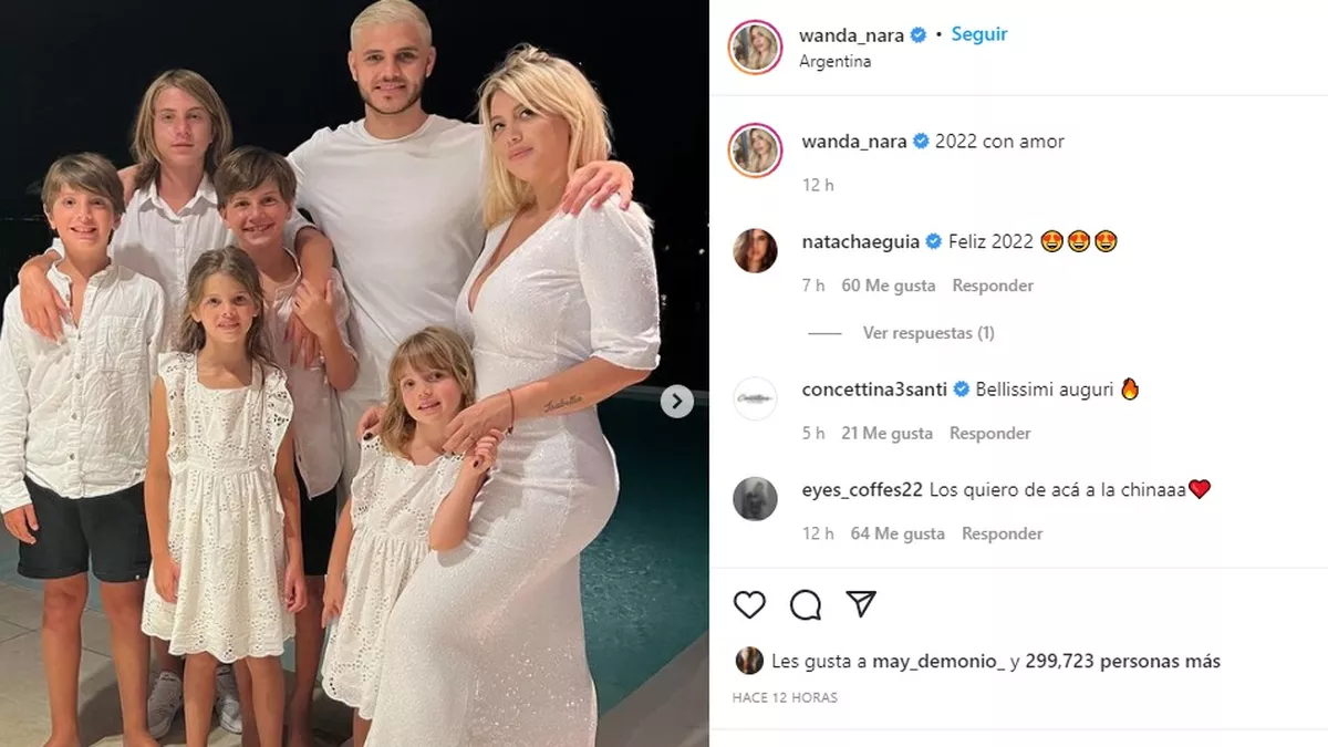 La empresaria Wanda Nara y el futbolista Mauro Icardi pasaron la fiesta de año juntos a puro color blanco y en familia junto a los pequeños Francesca, Isabella, Valentino, Benedicto y Constantino.