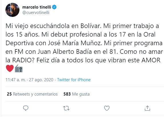 "Mi viejo escuchándola en Bolívar. Mi primer trabajo a los 15 años. Mi debut profesional a los 17 en la Oral Deportiva con José María Muñoz. Mi primer programa en FM con Juan Alberto Badía en el 81. Como no amar la RADIO? Feliz día a todos los que vibran este AMOR", recordó en Twitter.
