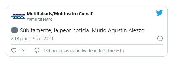 La triste noticia fue confirmada a través de Twitter desde la cuenta del Multiteatro.