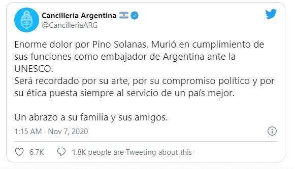 Cineasta, ex diputado nacional, ex senador y principal referente de la agrupación Proyecto Sur que integra el Frente de Todos, Solanas tenía 84 años y se encuentra en el grupo de riesgo etario más expuesto ante el coronavirus.