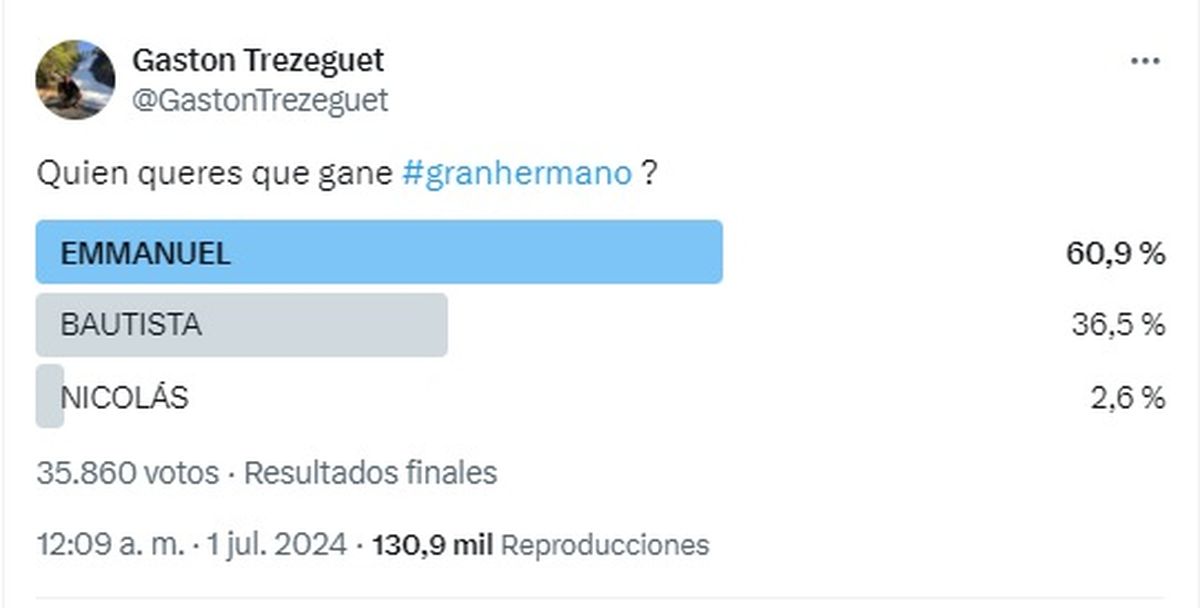 En tanto, la encuesta del productor y panelista de LAM (América TV) Fede Bongiorno también lanzó una encuesta similar el 1° de julio pasado. Y con los 101.610 votos que lleva hasta ahora, sus votantes también dan como ganador al peluquero cordobés, aunque por un porcentaje mucho menor: el 46,2 por ciento para Emma, el 43,7 por ciento para Bautista, el 3,4 por ciento para Nico, mientras que un 6,7 por ciento se inclinó por "No sé/No voto".