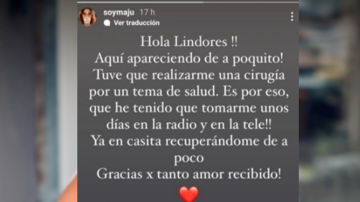 "Hola, lindores. Acá apareciendo de a poquito. Tuve que realizarme una cirugía por un tema de salud. Es por eso que he tenido que tomarme unos días en la radio y en la tele. Ya en casita recuperándome de a poco. Gracias por tanto amor", explicó Maju Lazano pero no brindó detalles de qué le pasa.