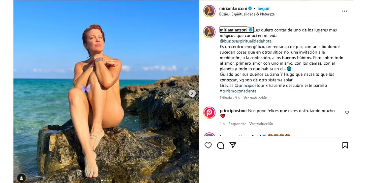 Miriam Lanzoni se mantiene siempre activa en las redes. Y en las últimas horas, compartió una nueva actualización en donde se mostró completamente desnuda en medio de sus vacaciones. La publicación fue horas después que Alejandro Fantino anunció que espera un segundo hijo.