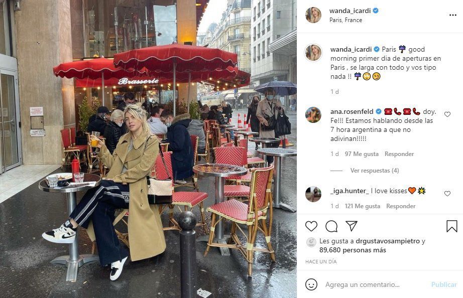 "Paris good morning primer día de aperturas en Paris , se larga con todo y vos tipo nada !!", escribió Wanda en el epígrafe de la imagen que compartió donde puede vérsela con joggineta, zapatillas, piloto y cartera, tomando un juguito de naranja en un alto de las compras en medio de la lluvia primaveral que invadía las calles parisinas.