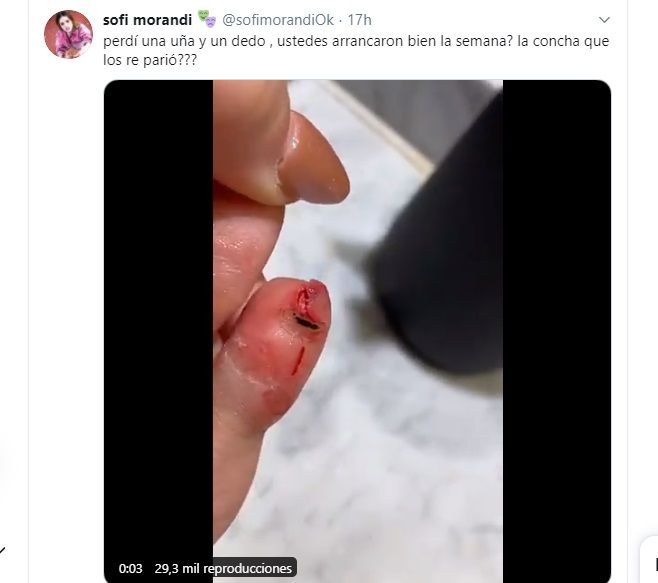 Sofi además mostró las fuertes imágenes de cómo quedó su dedo ensangrentado tras el inconveniente.