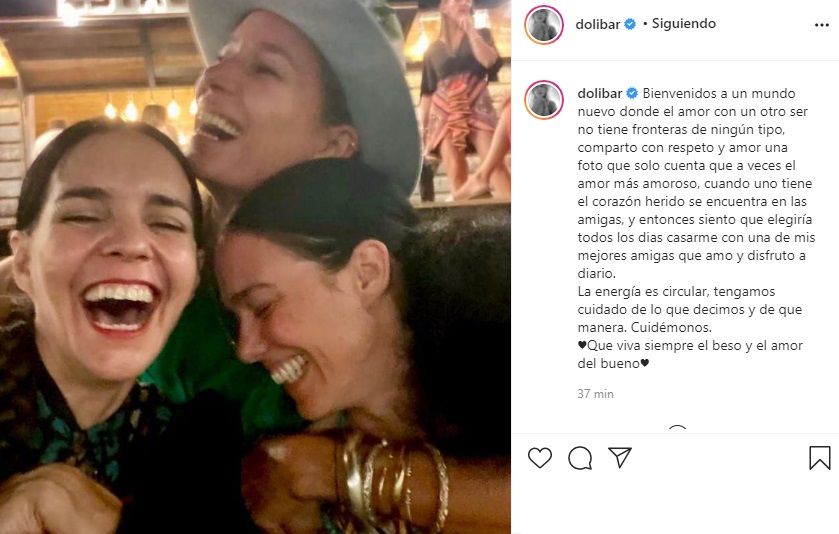 Y este jueves a la mañana, tras el revuelo que causó, Dolores borró la llamativa foto que había subido anoche y compartió otro posteo en donde aclara: "Bienvenidos a un mundo nuevo donde el amor con un otro ser no tiene fronteras de ningún tipo, comparto con respeto y amor una foto que solo cuenta que a veces el amor más amoroso, cuando uno tiene el corazón herido se encuentra en las amigas, y entonces siento que elegiría todos los días casarme con una de mis mejores amigas que amo y disfruto a diario. La energía es circular, tengamos cuidado de lo que decimos y de que manera. Cuidémonos. ♥️Que viva siempre el beso y el amor del bueno♥️"