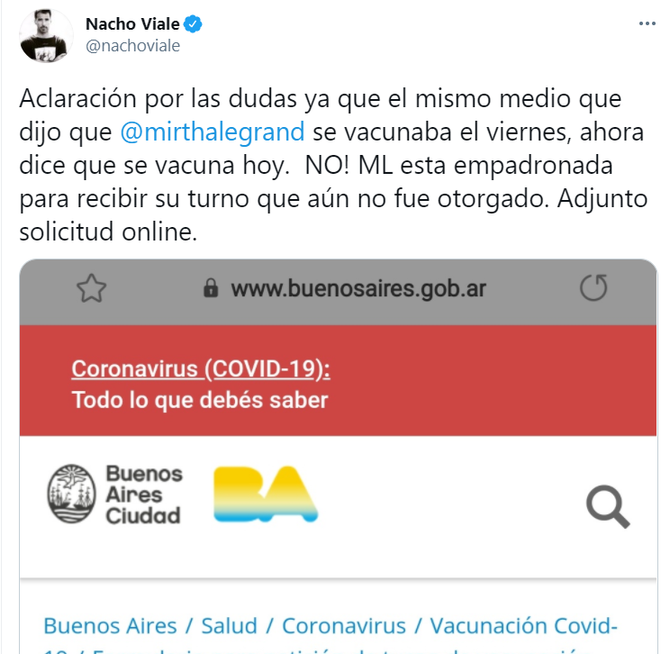 "Aclaración por las dudas ya que el mismo medio que dijo que @mirthalegrand se vacunaba el viernes, ahora dice que se vacuna hoy. NO! ML esta empadronada para recibir su turno que aún no fue otorgado. Adjunto solicitud online", escribió.