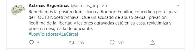 “Repudiamos la prisión domiciliaria a Rodrigo Eguillor, concedida por el juez del TOC10 Noceti Achaval. Que un acusado de abuso sexual, privación ilegítima de la libertad y lesiones agravadas esté en su casa, revictimiza y pone en riesgo a la denunciante. #LosVioladoresALaCárcel”, se focalizó.
