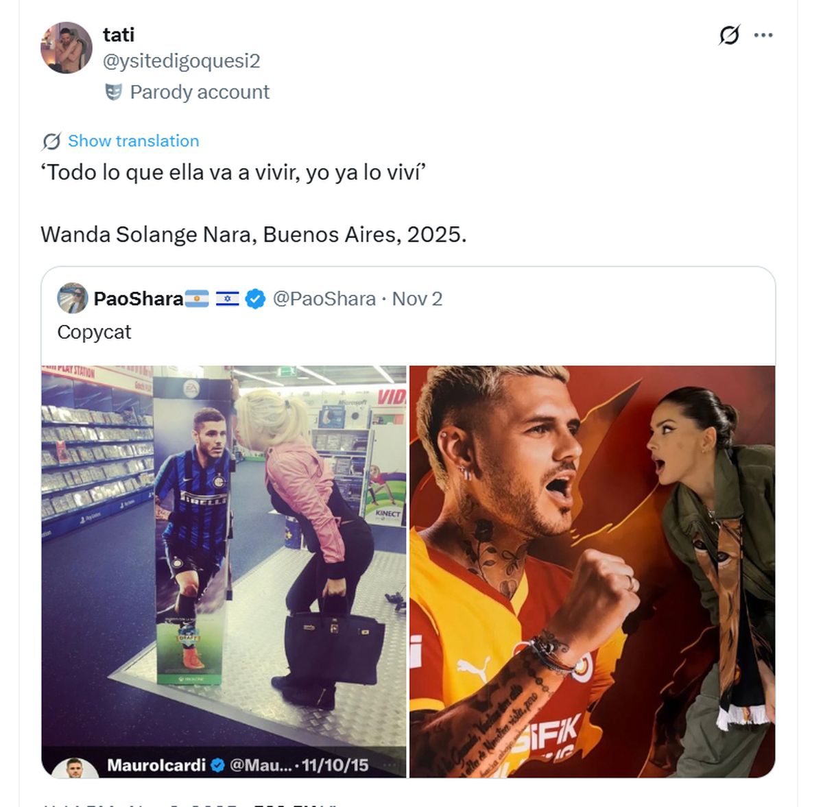 “Todo lo que ella va a vivir, yo ya lo viví”, escribió un usuario en X, acompañando las dos imágenes en un posteo que se viralizó. La frase remite a una declaración que Wanda había hecho en los comienzos del romance entre la China y el futbolista.