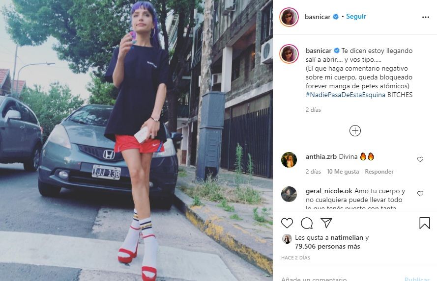 "Te dicen estoy llegando salí a abrir.... y vos tipo..... (El que haga comentario negativo sobre mi cuerpo, queda bloqueado forever manga de petes atómicos) #NadiePasaDeEstaEsquina BITCHES", indicó Asnicar.