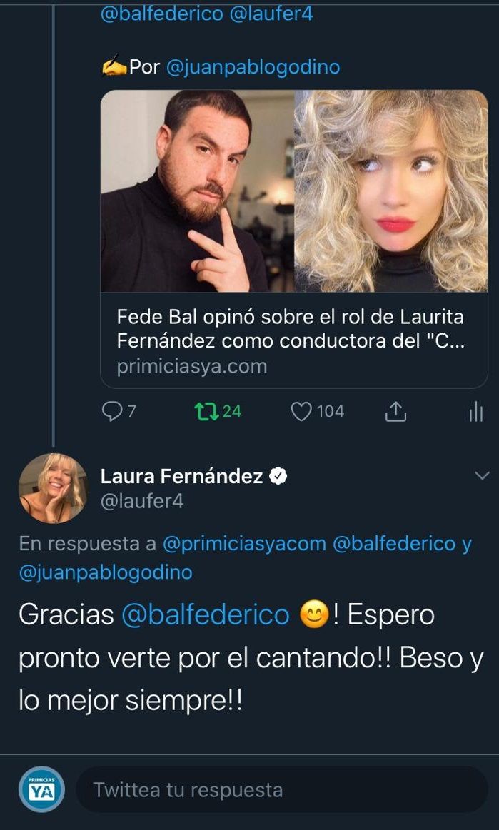 Y al ver esta nota, Laurita le agradeció a su ex las cálidas palabras que tuvo para con ella: "Gracias Fede. Espero pronto verte por el Cantando!! Beso y lo mejor siempre".