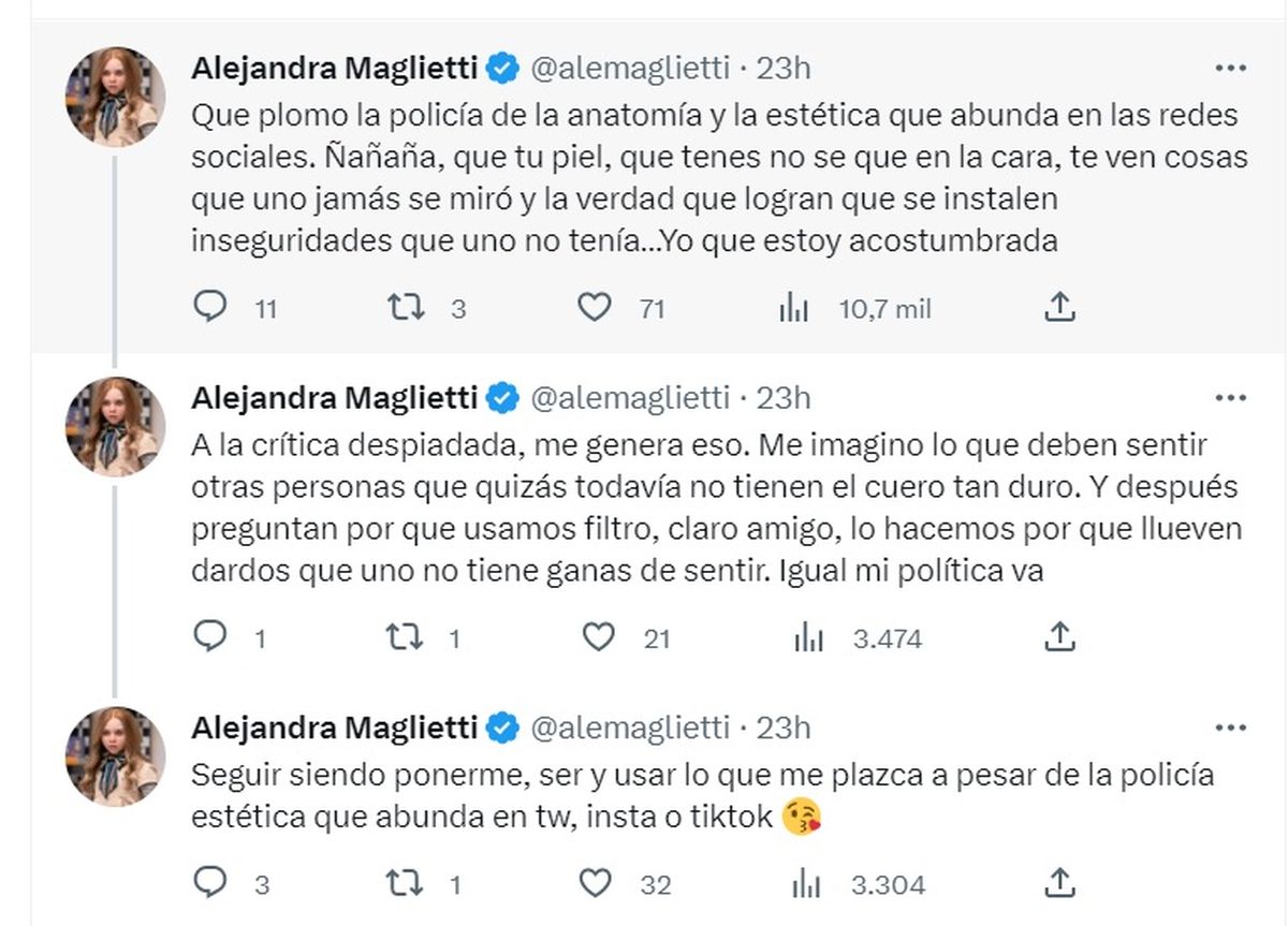 "Y después preguntan por qué usamos filtro, claro amigo, lo hacemos por que llueven dardos que uno no tiene ganas de sentir. Igual mi política va a seguir siendo ponerme, ser y usar lo que me plazca a pesar de la policía estética que abunda en Tw, Insta o TikTok", cerró la rubia firme.