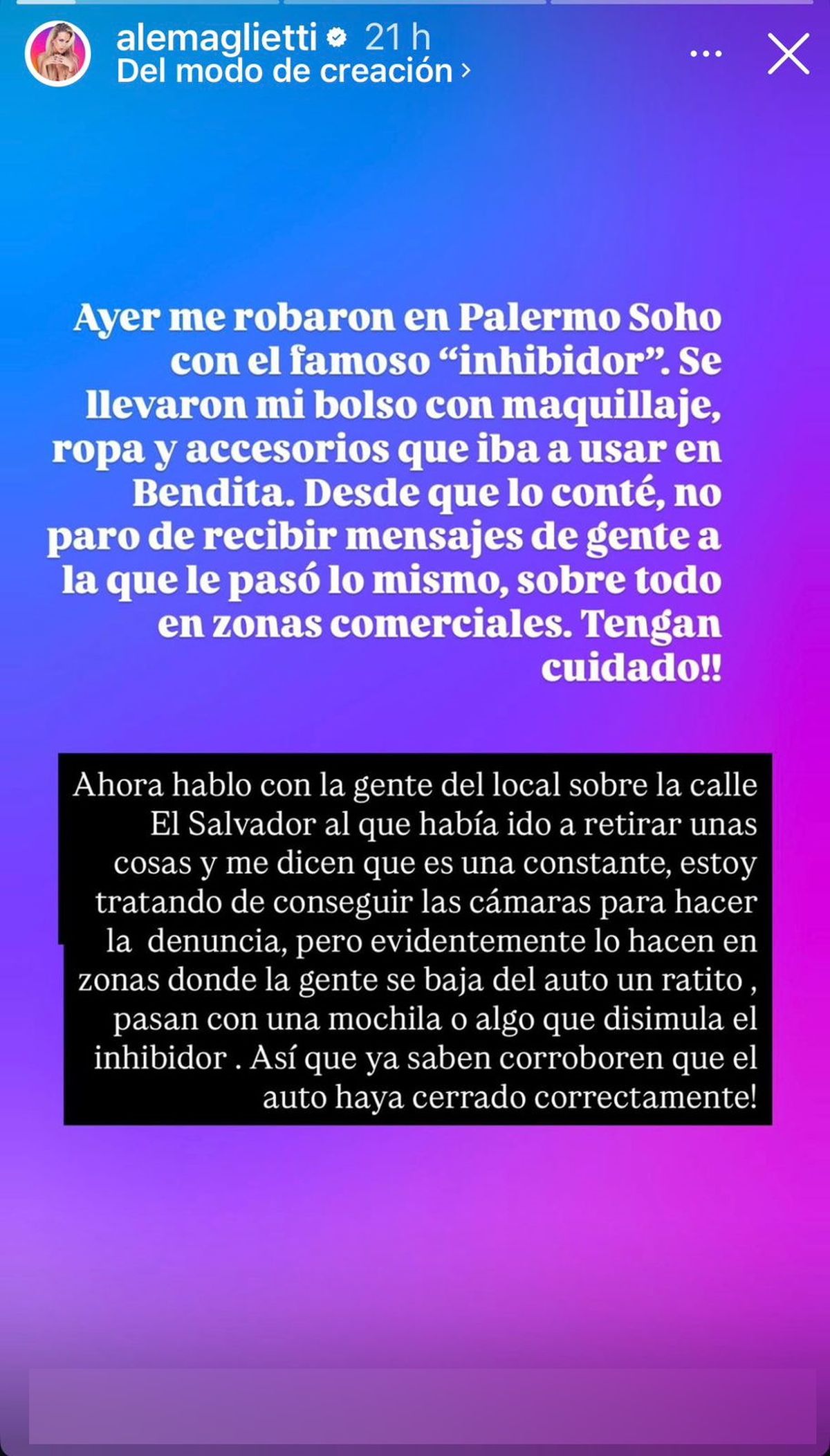 Por último, Maglietti hizo saber su decisión de denunciar el hecho ante las autoridades correspondientes. “Estoy tratando de conseguir las cámaras para hacer la denuncia, pero evidentemente lo hacen en zonas donde la gente se baja del auto un ratito, pasan con una mochila o algo que disimula el inhibidor”, concluyó furiosa ante la constante inseguridad que golpea al país.