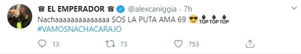 Tras este escándalo al aire, Alex Caniggia, que renunció semanas atrás al reality, dio su veredicto desde las redes sociales y bancó a la jurado: "Nachaaaaaaaaaaaaaa sos la puta amaaaa 69. #Vamosnachacarajo", expresó "El emperador" en Twitter.