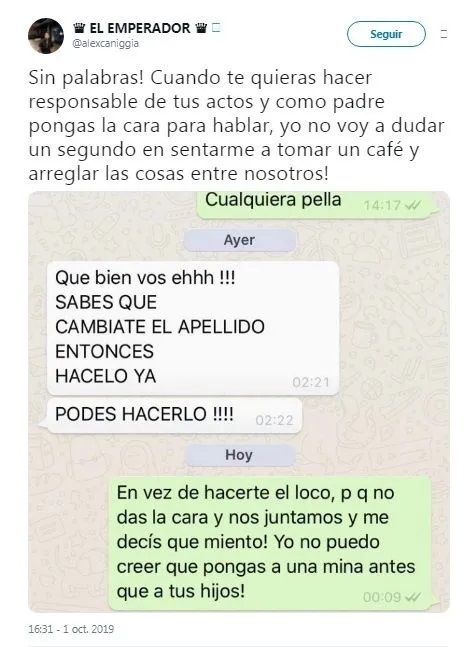Junto a la captura de la conversación por WhatsApp, Alex escribio: “¡Sin palabras! ¡Cuando te quieras hacer responsable de tus actos y como padre pongas la cara para hablar, yo no voy a dudar un segundo en sentarme a tomar un café y arreglar las cosas entre nosotros!”.
