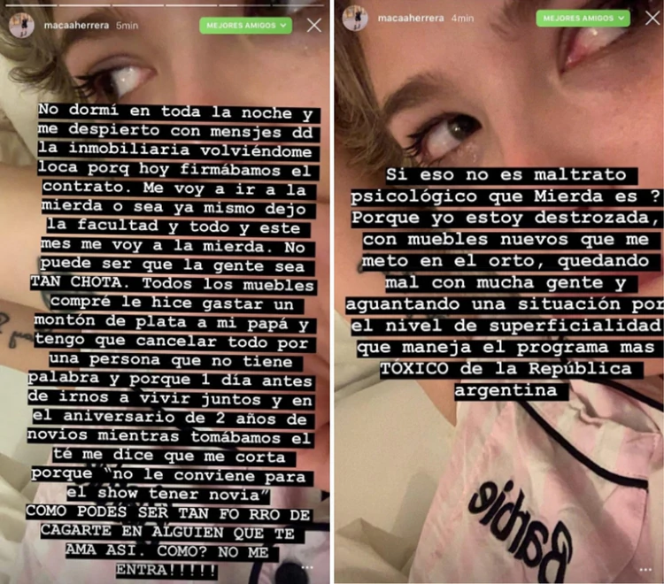 Según el posteo que salió de la cuenta de Instagram de Macarena, el motivo por el cual Alexander se habría querido separar es “porque ‘no le conviene para el show tener novia’”. “¿Cómo podés ser tan forro de cagarte en alguien que te ama así? ¿Cómo? ¡¡No me entra!! Si eso no es maltrato psicológico, ¿qué mierda es?”.