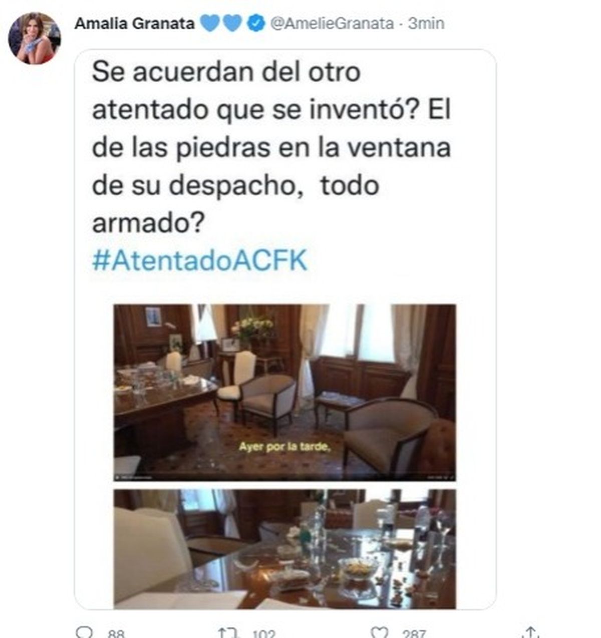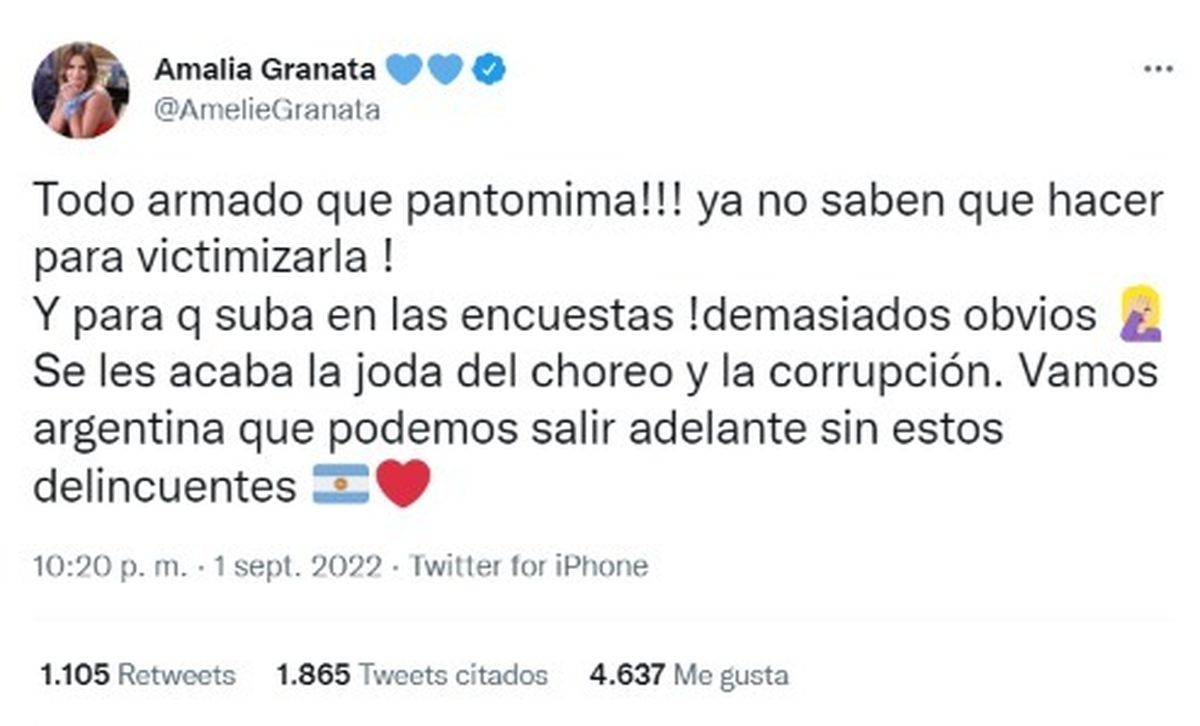 "Todo armado que pantomima!!! Ya no saben qué hacer para victimizarla! Y para que suba en las encuestas! Demasiado obvios. Se les acaba la joda del choreo y la corrupción. Vamos Argentina que podemos salir adelante sin estos delincuentes", posteó en su cuenta de Twitter.