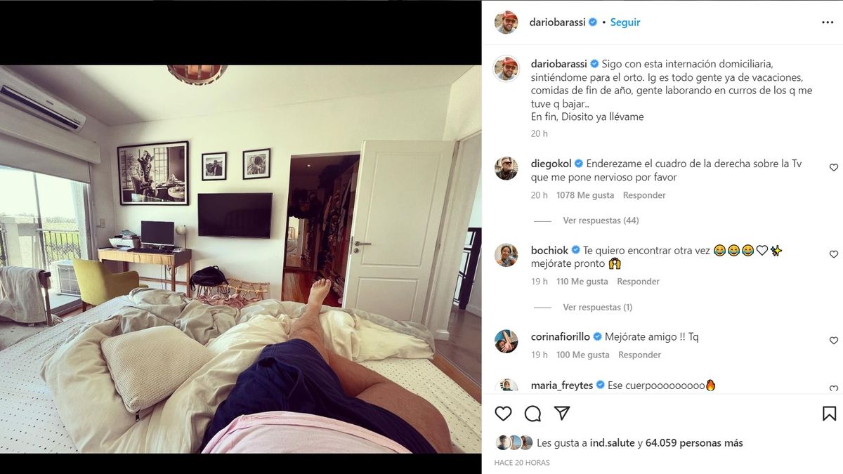 Luego, en otro mensaje, el conductor mostró cómo seguía con su recuperación en una internación domiciliaria: "Sigo con esta internación domiciliaria, sintiéndome para el orto. IG es todo gente ya de vacaciones, comidas de fin de año, gente laborando en curros de los q me tuve que bajar.. En fin, Diosito ya llévame", se lamnetó.